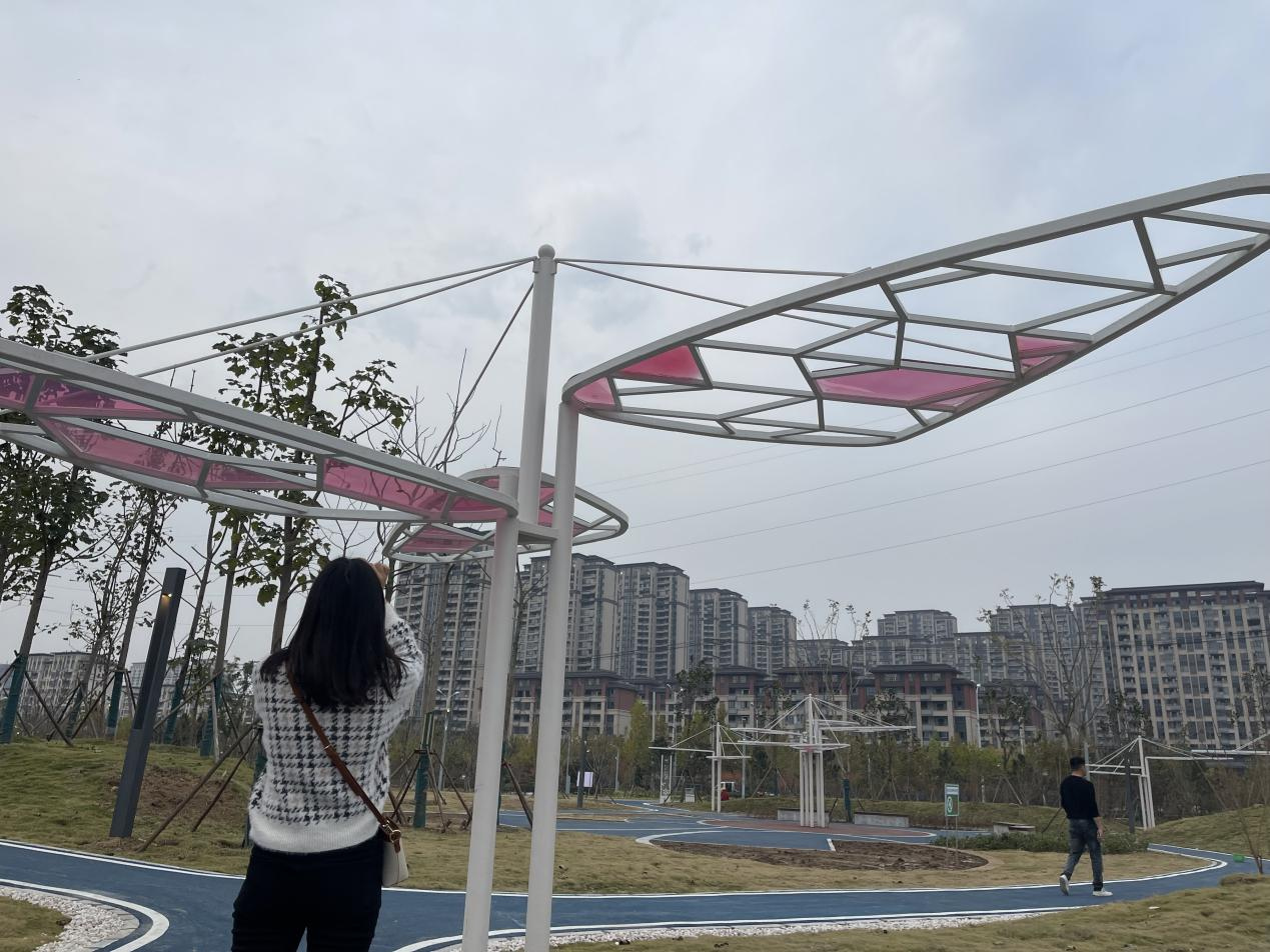 在正式驗(yàn)收完之后,公園對(duì)外開放了部分景觀,吸引了廣大市民前來游玩,漫步公園跑道,聆聽花草絮語。幼童奔跑在草坪沙坑,樂此不疲;青年拼搏在籃球場之上,揮灑汗水;彩色玻璃如蟬翼,早有少女于此處拍照留念;林中小徑通幽處有一四角方亭,卻是歇腳聽曲的好去處。白天褪去了它的顏色,夜色拉開了它的帷幕,公園里彩燈高照,于高處俯瞰而下,星光點(diǎn)點(diǎn),霓虹閃耀。光影之間,似蝴蝶似芍花的圖案便清晰的呈現(xiàn)在你的眼前;明暗之處,溫柔朦朧的氣質(zhì)撲面而來。你很難想象,半年前,這里還尚是一片亂林,樹木凌亂,雜草叢生。我們見證了它的改變,我們參與了它的改變。